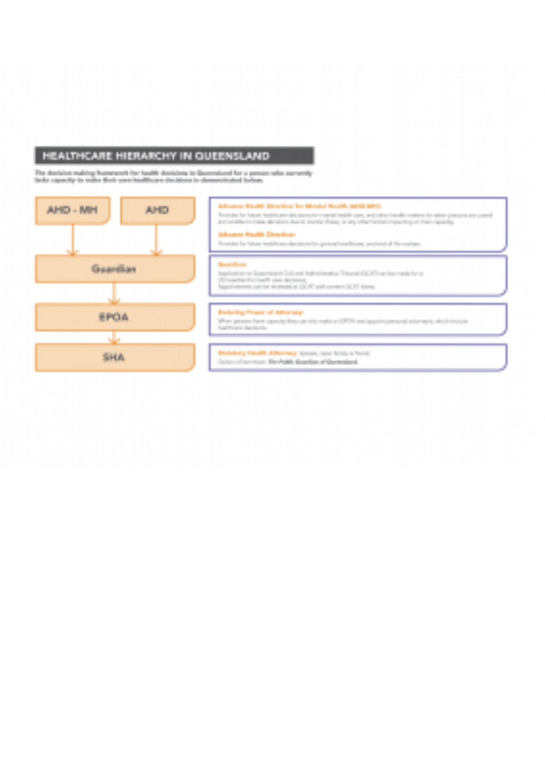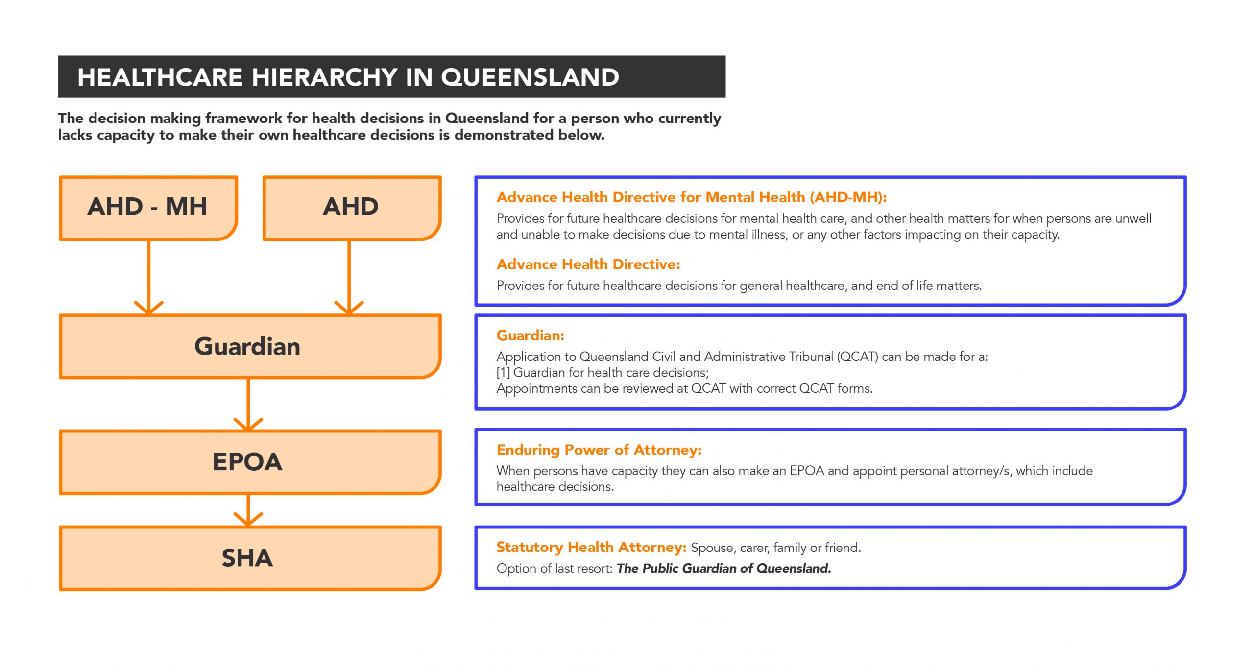 Healthcare Hierarchy in Queensland – The decision-making framework for health decisions in Queensland for a person who currently lacks capacity to make their own healthcare decisions is demonstrated below.