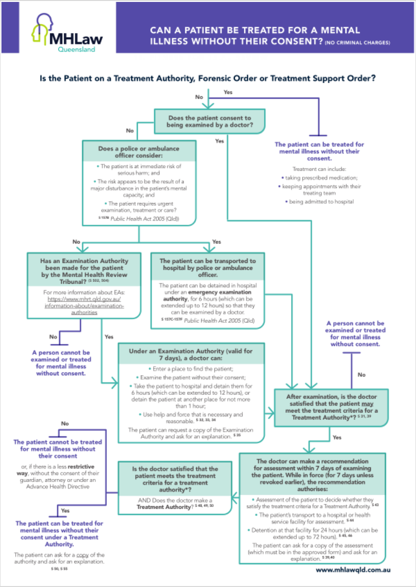 The Public Guardian, when acting as the appointed decision maker (via AHD/EPOA or QCAT) for adults lacking decision making capacity, enforces decision making guidelines when asked to consent to mental health treatment and care.Where a doctor or authorised mental health practitioner is seeking the consent of the Public Guardian to mental health treatment and care, they must review the Guide: Applying to the Public Guardian for Mental Health Treatment Consent and then complete the Application for Mental Health Treatment and Care Consent Form and submit to: