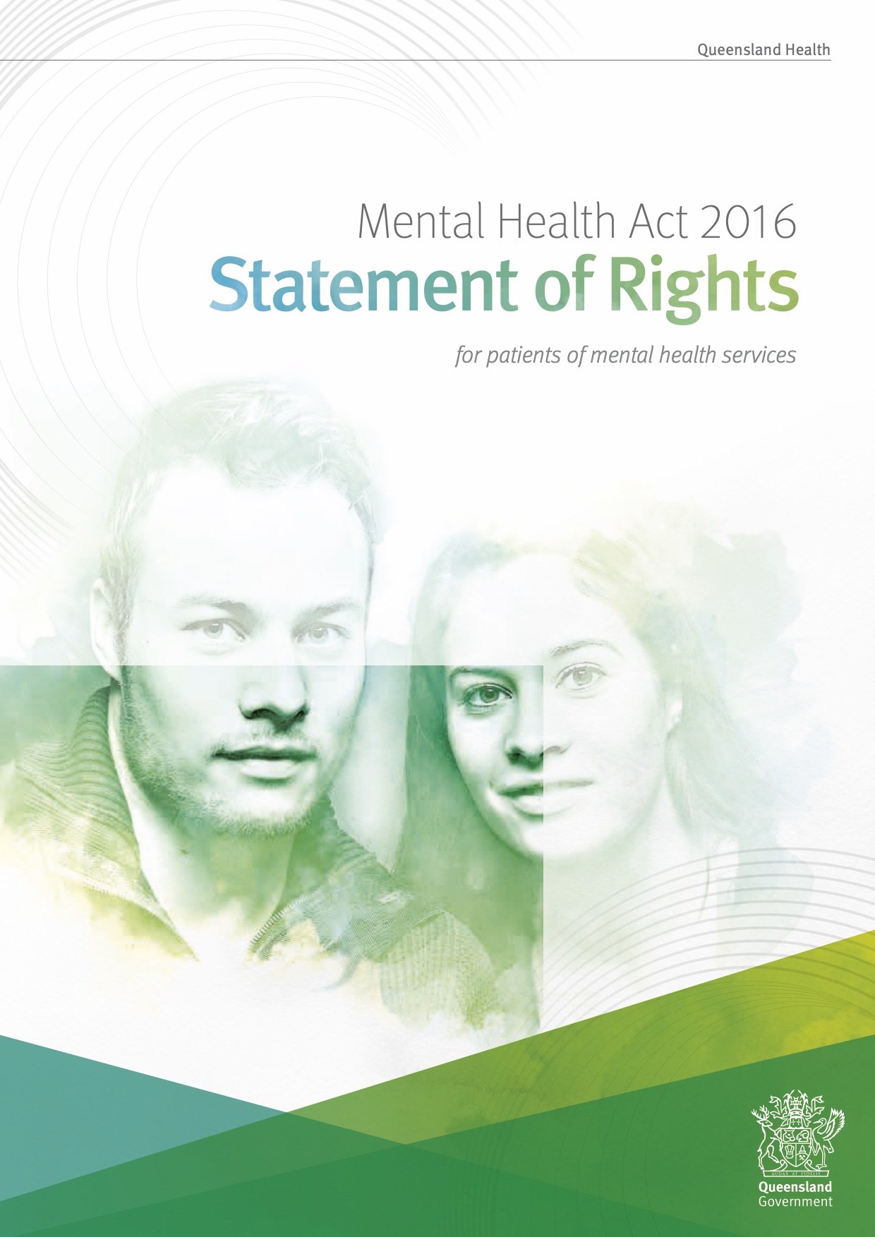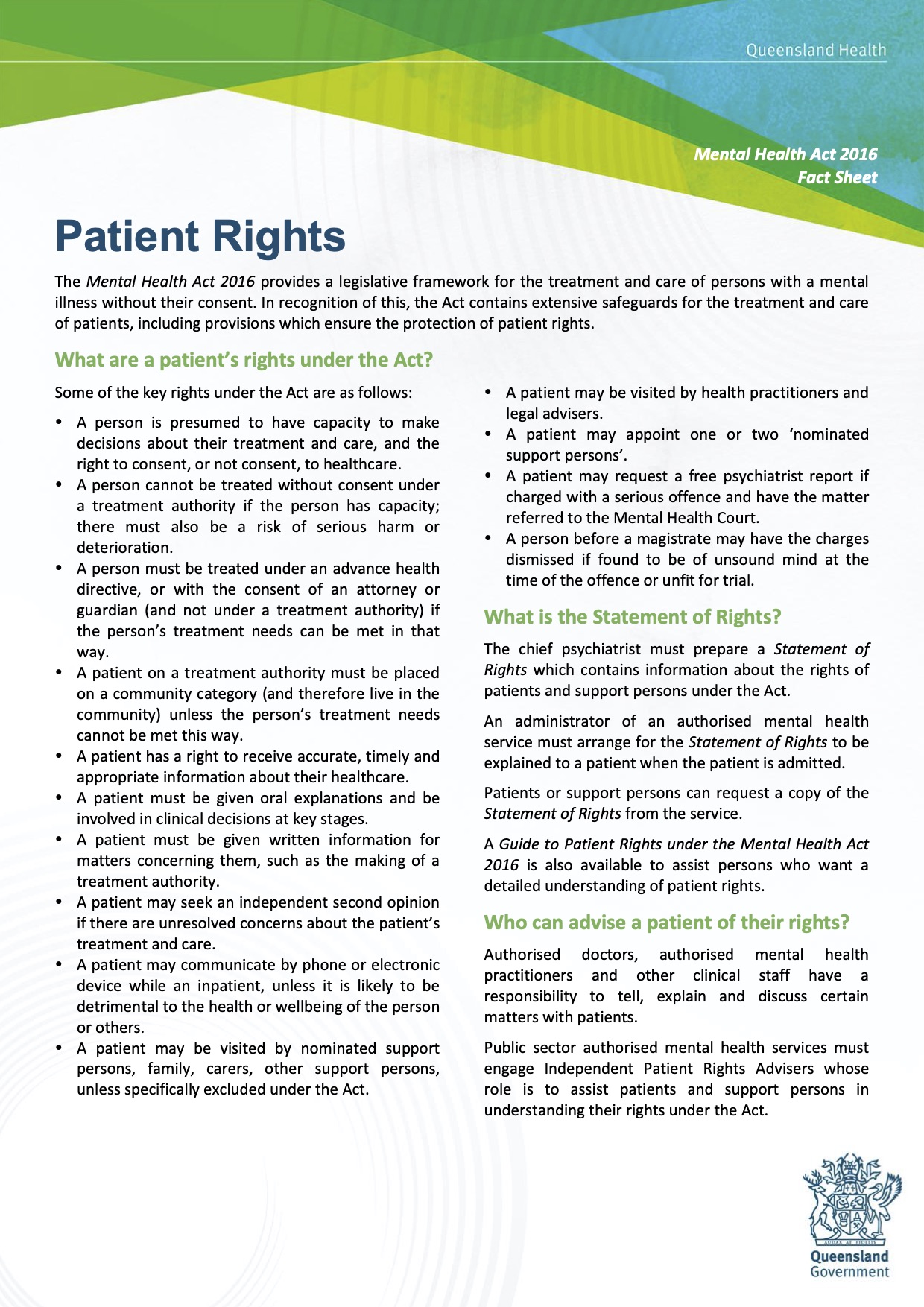 The following consumer resources are available to help patients, their families, carers and other support persons understand the provisions for consumers under the Mental Health Act 2016.Key Rights Document - Qld Health Statement of Rights