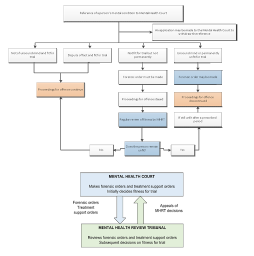 The blue boxes show the role of the MHRT in terms of review of the forensic order and review of the person’s fitness for trial.