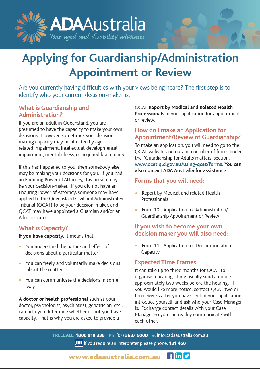 Guardians may be family members or friends of the person with a disability or they may be a delegate from the Public Guardian of Qld.